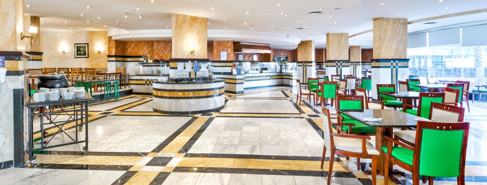 Основен ресторант, 3 а-ла-карт ресторанта (италиански - 1 посещение седмично, безплатно сет меню с предварителна резервация), рибен (платен), грил до басейна (платен за обяд, безплатен снакс), пица снек бар (платен), 6 бара (3 платени), 2 открити басейна (1 отопляем през зимата), СПА център, конферентна зала, магазини.