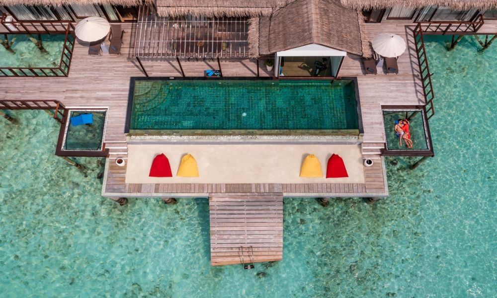 - EARTH POOL PAVILLION: площ 185 кв.м., макс. 2 възрастни + 1 дете + 1 бебе/ 3 възрастни + 1 бебе - инфинити басейн (20 кв.м.) с изглед към живописната лагуна, гарантирана гледка към залеза.