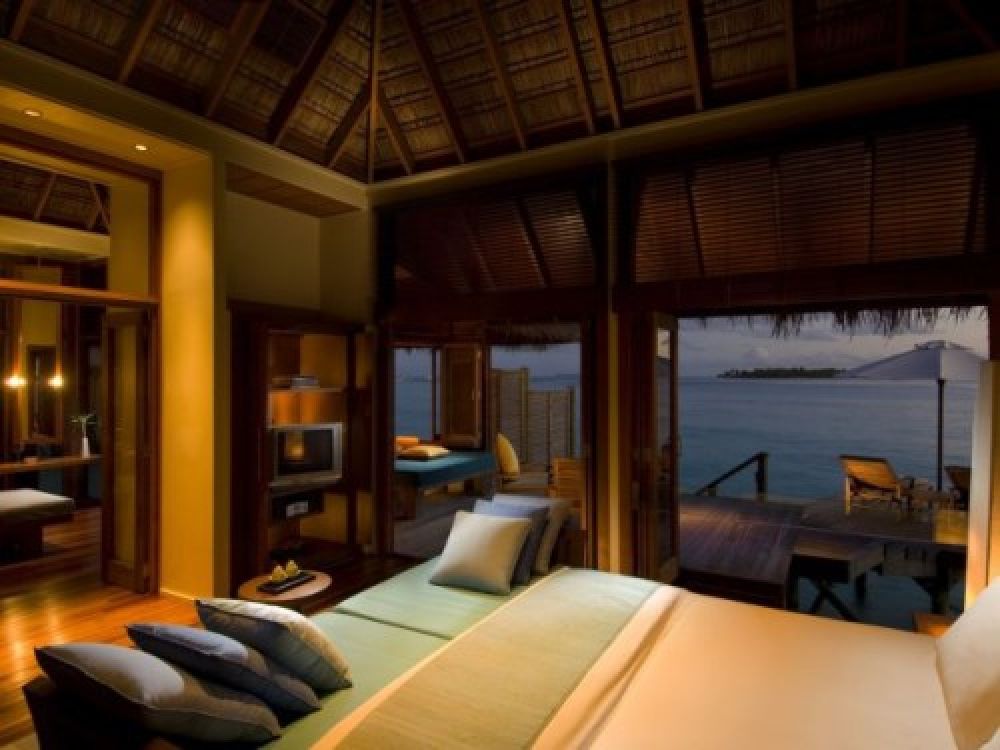 - 5 Two Bedroom Grand Water Villa (150 м2) Тези вили са разположени на кокили над лагуната, точно до спа центъра. Разполагат с две спални (едната с голямо двойно легло, другата с две единични легла), баня и тераса с джакузи, шезлонги, кът за сядане и достъп до лагуната.