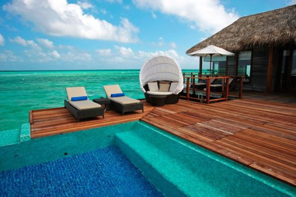 - 2 Premier Water Villa with Pool (152 м2) По-просторни водни вили с басейн. Вилата разполага с просторна спалня с хол (спалня с двойно легло), баня с джакузи и гледка към океана, просторна тераса с басейн, зони за релакс и достъп до лагуната.