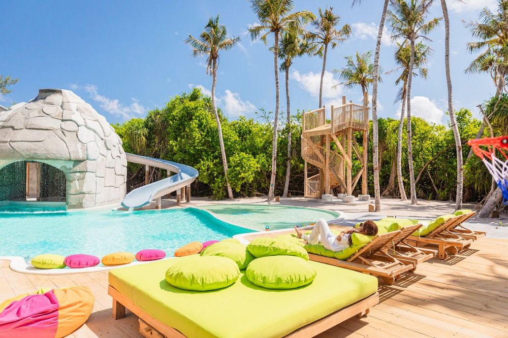 • 18 One Bedroom Water Retreat with Slide (411 кв.м.) - две равни водни вили с плъзгащ се покрив в северната част на острова. На приземния етаж има двойно легло, детска спалня, съблекалня, съблекалня, баня с вана, открит душ, кът за сядане, тераса с басейн със солена вода и хамаци на вода, шезлонги и спускане в океана. На втория етаж - павилион за хранене, тераса с водна пързалка. Максимално настаняване е 3 възрастни или 2 възрастни и 2 деца.