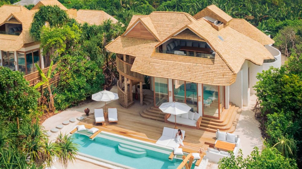 • 1 Four Bedroom Water Retreat with Slid (1291 кв.м) е вила на два нива в северната част на острова. На партерния етаж - две спални с двойно легло, офис, съблекалня, 2 бани, парна баня, сауна, хол с трапезария, тераса с водна пързалка, с басейн със солена вода и хамаци над водата, шезлонги и спускане в океана. На втория етаж има спалня с двойно легло, детска спалня, фитнес зала, баня с душ. Максималното настаняване е 10 възрастни или 8 възрастни и 6 деца.
