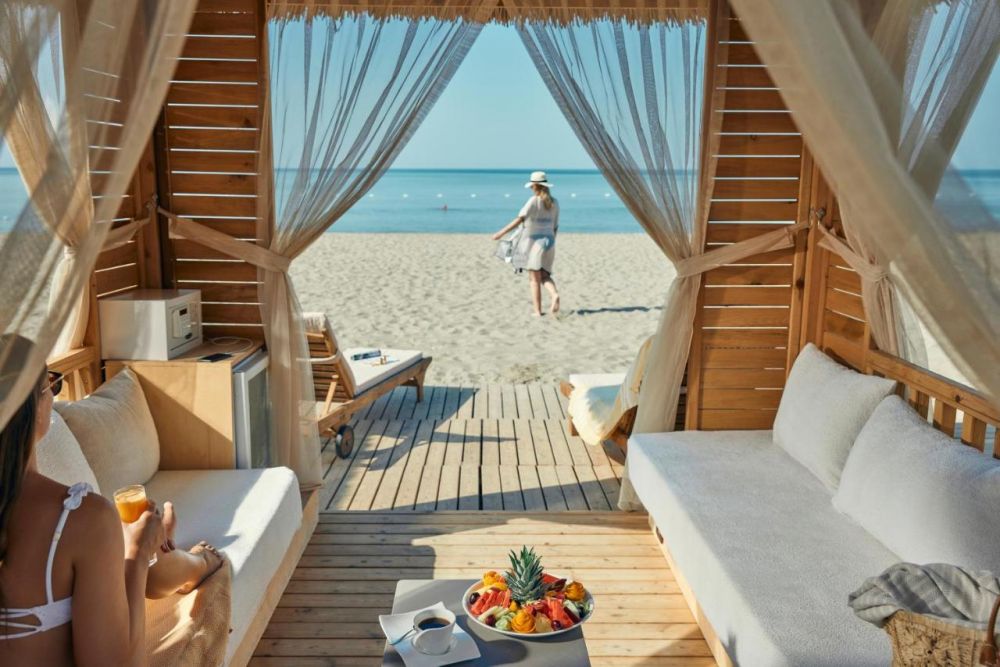 Собствен, пясъчен. Чадъри и шезлонги – безплатно, плажни кърпи – срещу депозит.