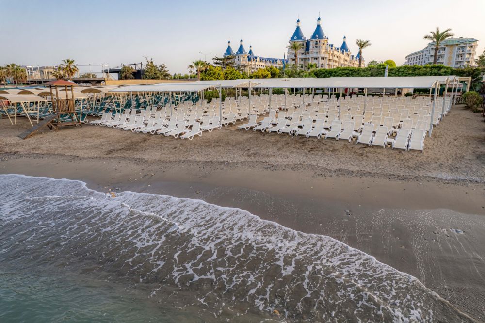Собствен, пясъчно - чакълест. До плажа се стига посредством подземен тунел. Чадъри, шезлонги и плажни кърпи на плажа и при басейна – безплатно.