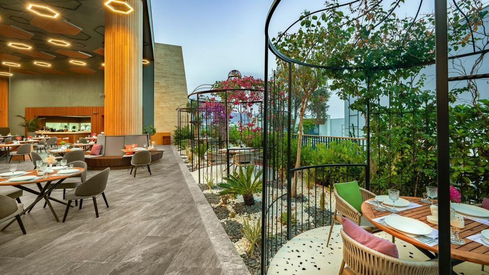 Основен ресторант, 3 а- ла- карт ресторанта/италиански, турски и рибен/, 4 бара, дискотека, открит и закрит басейн, СПА център, хамам, сауна, фитнес, масажи, 3 водни пързалки, магазини, паркинг. За децата: Детско меню, детски басейн, водни пързалки, детска площадка, мини дискотека, бебешко креватче, бебешки столчета, бебефон и други бебешки приспособления/със предварителна заявка - безплатно/. Безплатни услуги: Сауна, турска баня, фитнес, аеробика, тенис корт, наем на ракети и топки за тенис, волейбол, кино, немоторни водни спортове, кану, водно колело, анимация, интернет. Платени услуги: СПА център, масажи, фризьор, магазини, билярд, боулинг, моторни водни спортове.