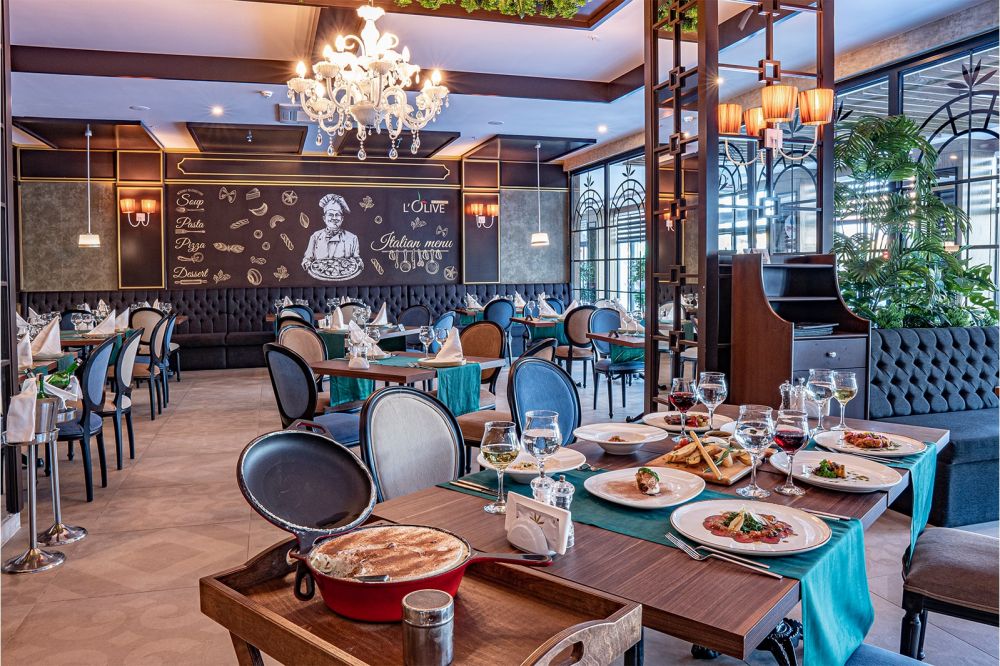 Основен ресторант, 2 а-ла-карт ресторанта (италиански и далекоизточен - 1 безплатно посещение на 1 от ресторантите при минимум 7 нощувки, с предварителна резерваия), 2 снек ресторанта, сладкарница, станция за сладолед и палачинки, 5 бара, кафетерия, диско бар, открит и закрит (отопляем) басейн, аквапарк, СПА център, магазини, конферентна зала.