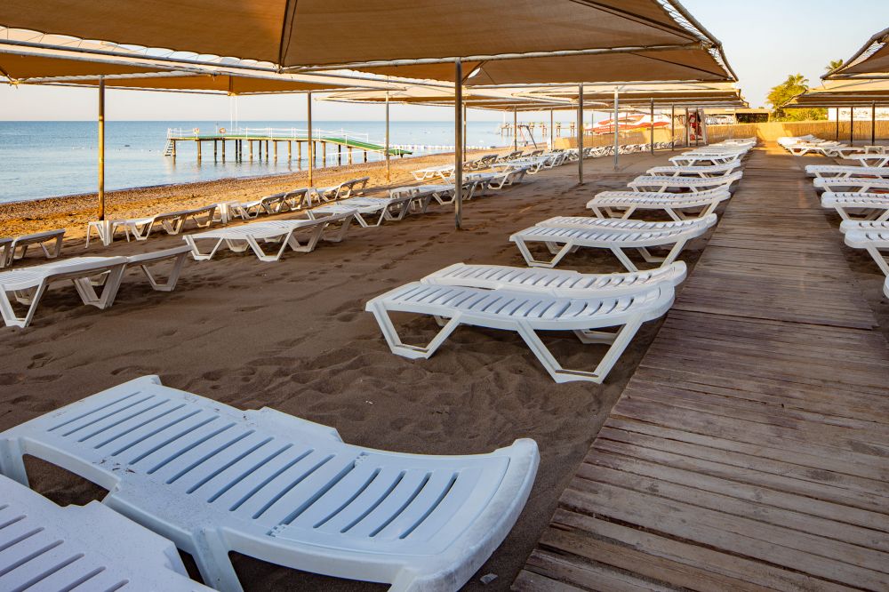 Собствен, пясъчно - чакълест. Чадъри, шезлонги и плажни кърпи на плажа и при басейна – безплатно.