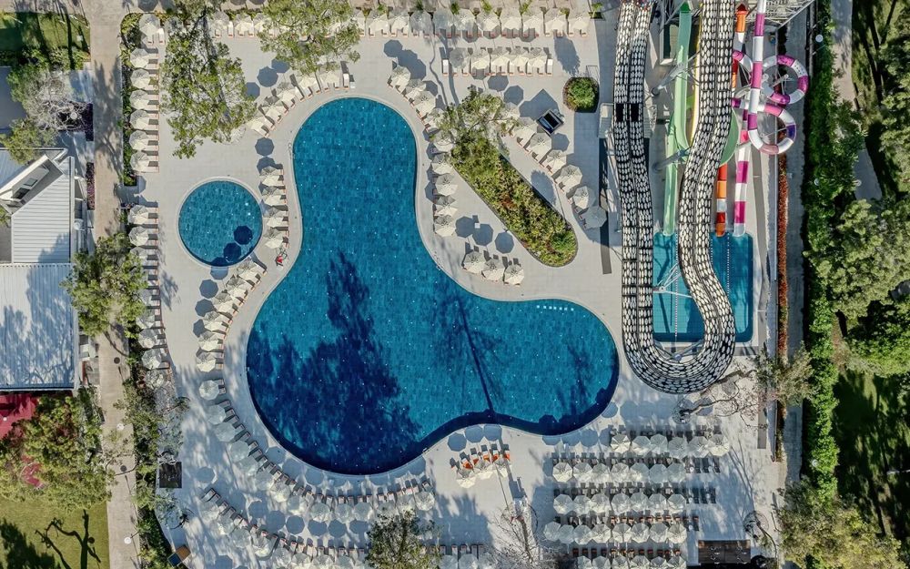 Намира се на 52 км от летище Анталия, на 45 км от центъра на Анталия, на 5 км от центъра на Кемер, на брега на морето. Изцяло реновиран през 2024 г., на обща площ от 60 000 м2.