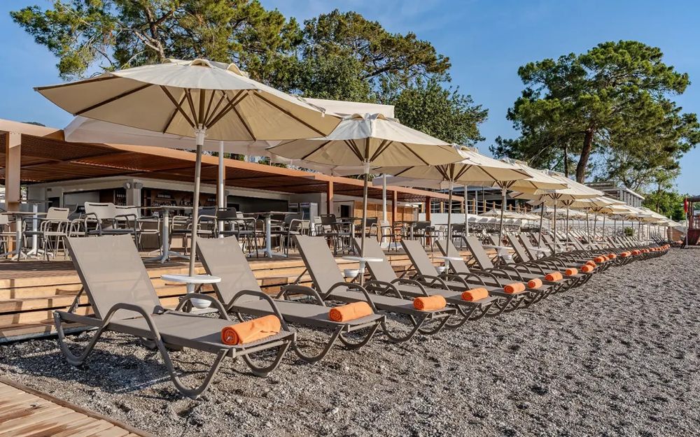 Собствен, пясъчно – чакълест, притежаващ сертификат „Син флаг“, с дължина на плажната ивица 200м. Чадъри, шезлонги и плажни кърпи на плажа и при басейна – безплатно.