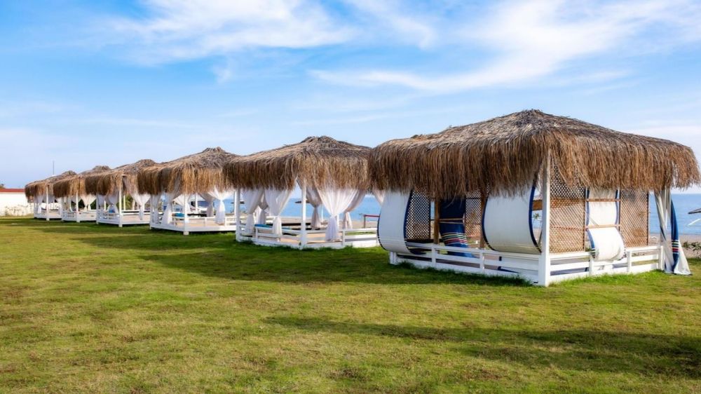 Хотелът има собствен плаж: пясъчно-чакълест, с директен достъп. Шезлонги, чадъри и плажни кърпи — включени за гостите.