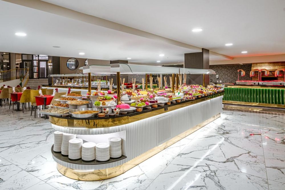 Основен ресторант, а-ла-карт ресторант – интернационален (1 безплатно посещение минимум 7 нощувки), сладкарница, 3 бара, открит и закрит басейн, водни пързалки, СПА център.