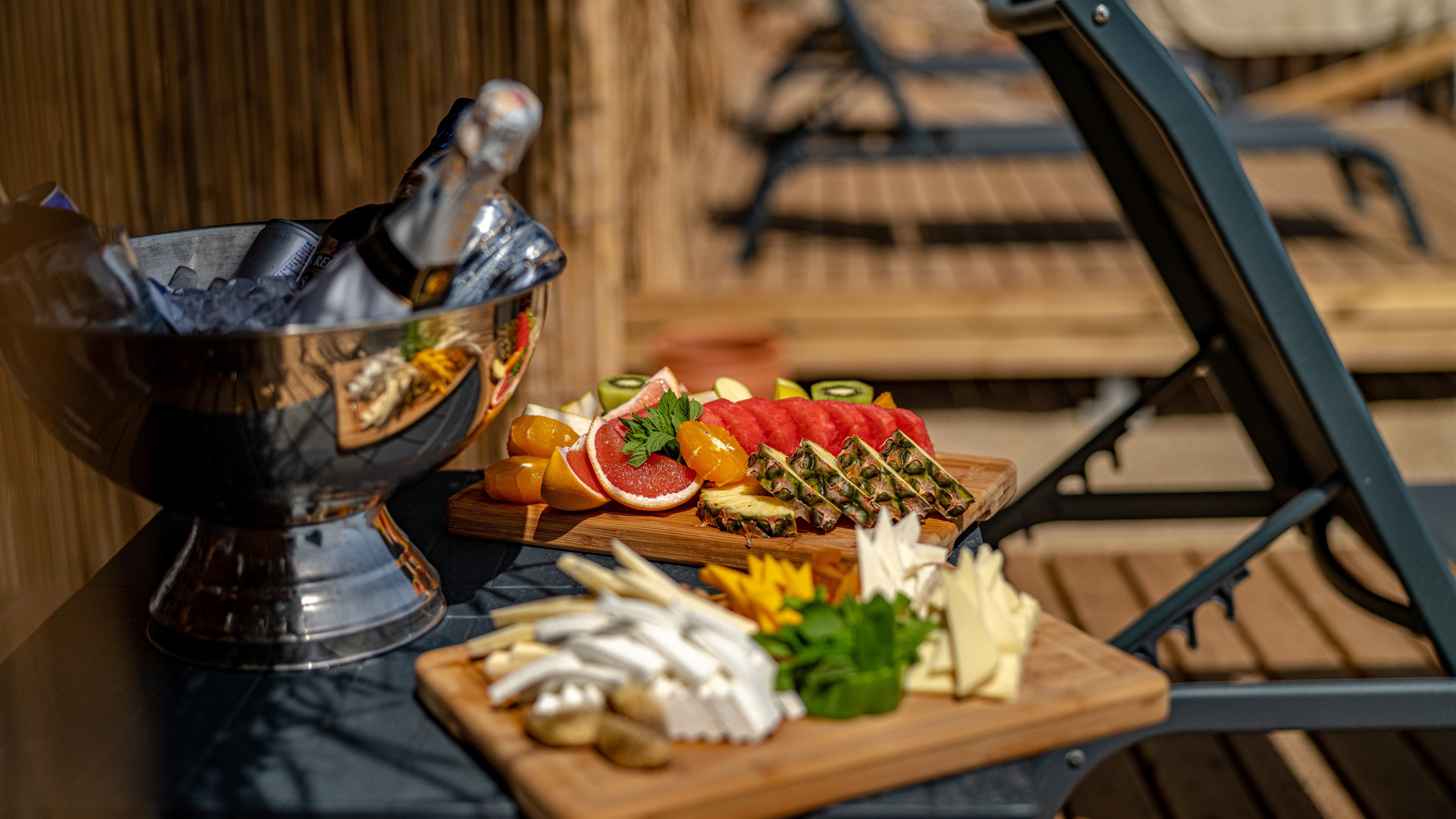Собствен, пясъчно - чакълест и платформа - чадъри, шезлонги, плажни кърпи и матраци на плажа и при басейна - безплатно.