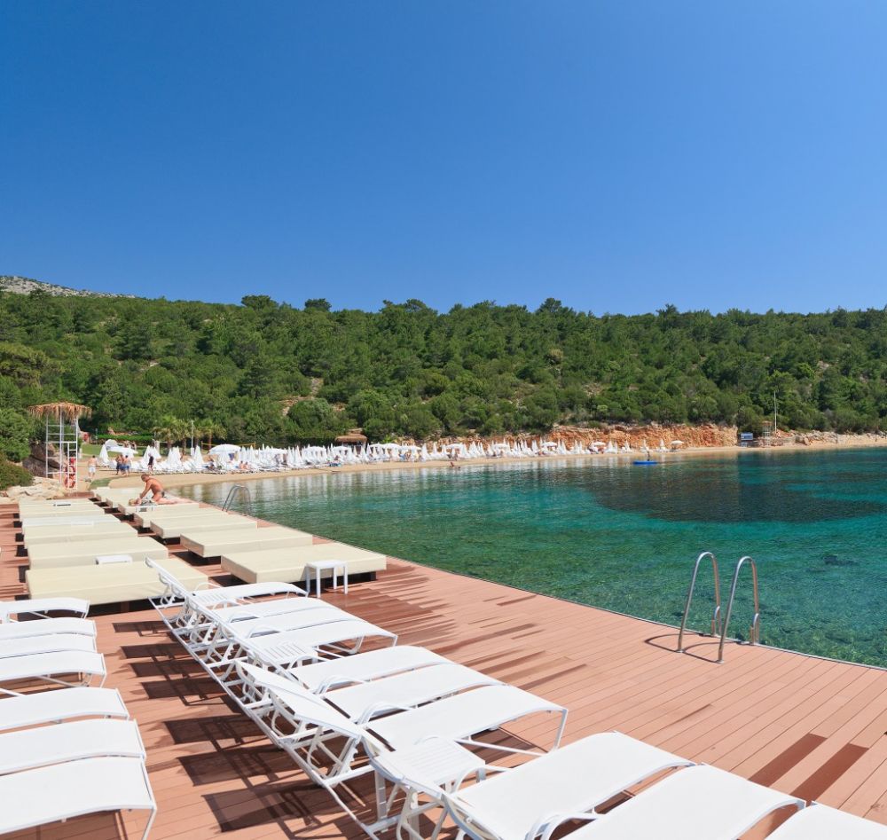 Собствен пясъчno-чакълест плаж и 2 платформи. Чадъри, шезлонги на плажа и при басейна - безплатно. Плажни кърпи срещу депозит.
