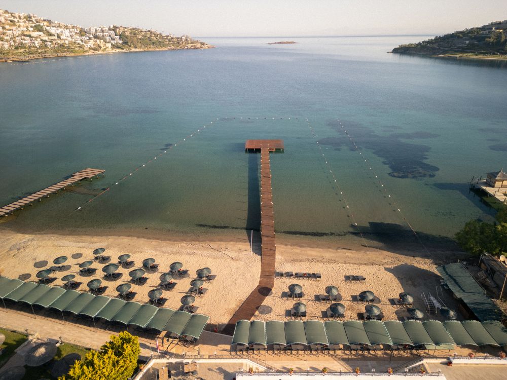 Собствен, пясъчно - чакълест. Чадъри и шезлонги на плажа и при басейна – безплатно. Плажни кърпи срещу депозит.