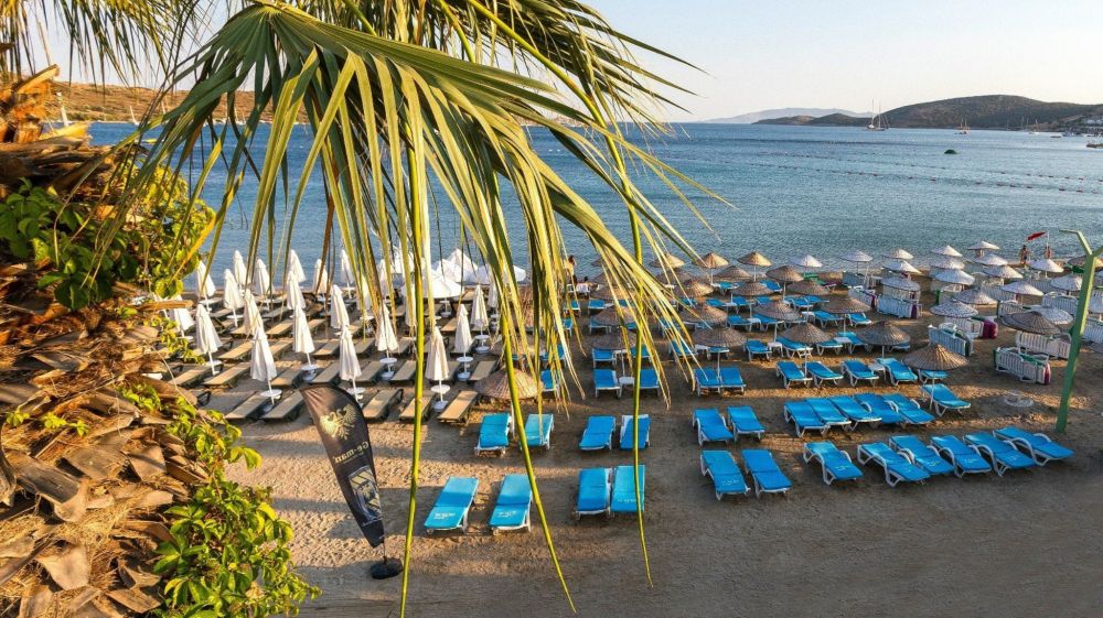 Собствен, пясъчно - чакълест. Чадъри, шезлонги и плажни кърпи на плажа и при басейна - безплатно.