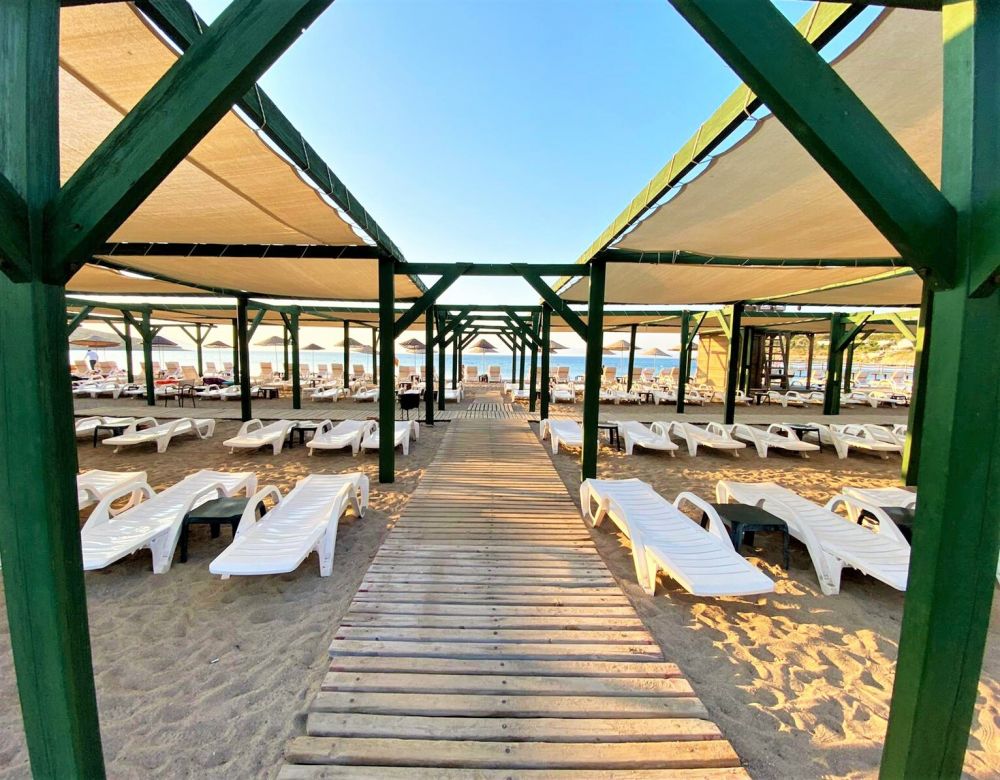 Собствен, пясъчен. Чадъри, шезлонги, матраци и плажни кърпи на плажа и при басейна - безплатно.