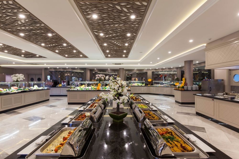 Oсновен ресторант Karya, два а-ла-карт ресторантa (турски Begonvil и рибен Teras Seafood - с предварителна резервация, едно безплатно посещение за престой от минимум три нощувки), 6 бара - Palm Bar, Roof Bar, Pool Bar, Sea Bar, Snack Bar и Olive Bar.