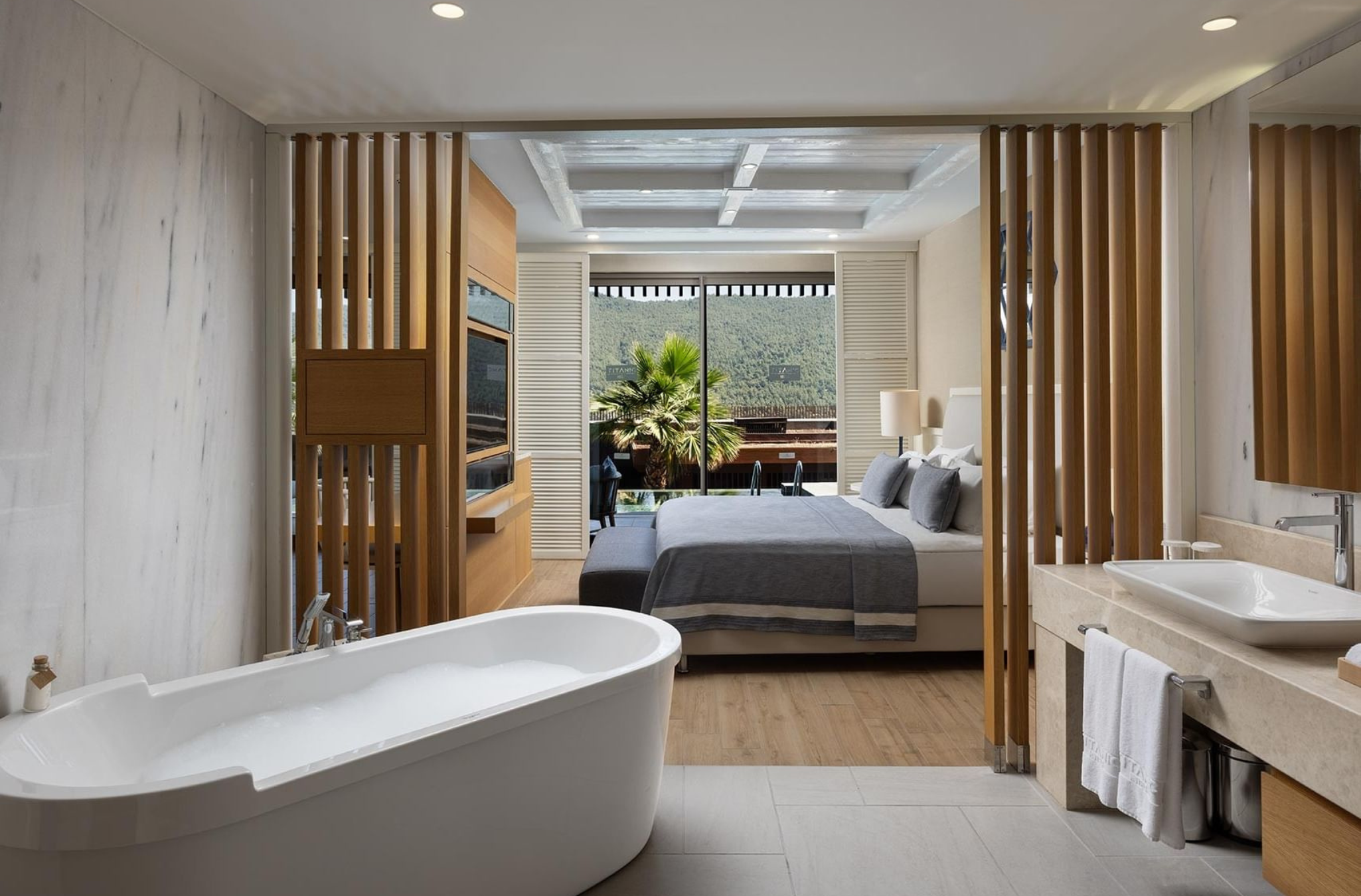 Стаи: Sea view room (спалня, баня, с изглед към море, 39 - 47 м²), Superior room (спалня със зона за сядане, баня – 51 м²), Deluxe room (спалня със зона за сядане, баня – 80-85 м²), Family Room (1 спалня, отделна стая с 2 легла, 2 бани – 54 м²), Standard swim-up room (спалня, баня, с директен достъп до общ басейн, тераса – 39 м²), Superior swim-up room (спалня със зона за сядане, баня, с директен достъп до общ басейн, тераса с два шезлонга – 51 м²), Swim Up Family Room (2 спални, 2 бани, с директен достъп до общ басейн, тераса с два шезлонга – 54 м²), Deluxe Swim Up Room (спалня със зона за сядане, с директен достъп до общ басейн, тераса с два шезлонга, вана и отделна душ кабина – 80-85 м²), Exclusive Swim Up (с директен достъп до общ инфинити басейн, спалня, баня с вана и отделна душ кабина, гардеробна зона, тераса с два шезлонга и джакузи; премиум услуги, закуска в ресторантите Hasır и Pascarella, ексклузивен минибар, безплатен румсървис, безплатни перални услуги – при минимум 7 нощувки, частна плажна кабана, личен иконом (butler service), частно бъги с иконом, кожен ключодържател и плажна чанта – 90 м²), Family Suite (фамилна стая суит, хол, кухненски бокс, спалня, детска спалня с 2 единични легла, 2 отделни бани, тоалетна, кът за сядане, работно бюро и балкон – 90 м²), Family Suite Room Swim Up (фамилна стая суит, директен достъп до басейна, 1 спалня, 1 отделен хол, 2 бани, кухненски бокс – 90 м²).