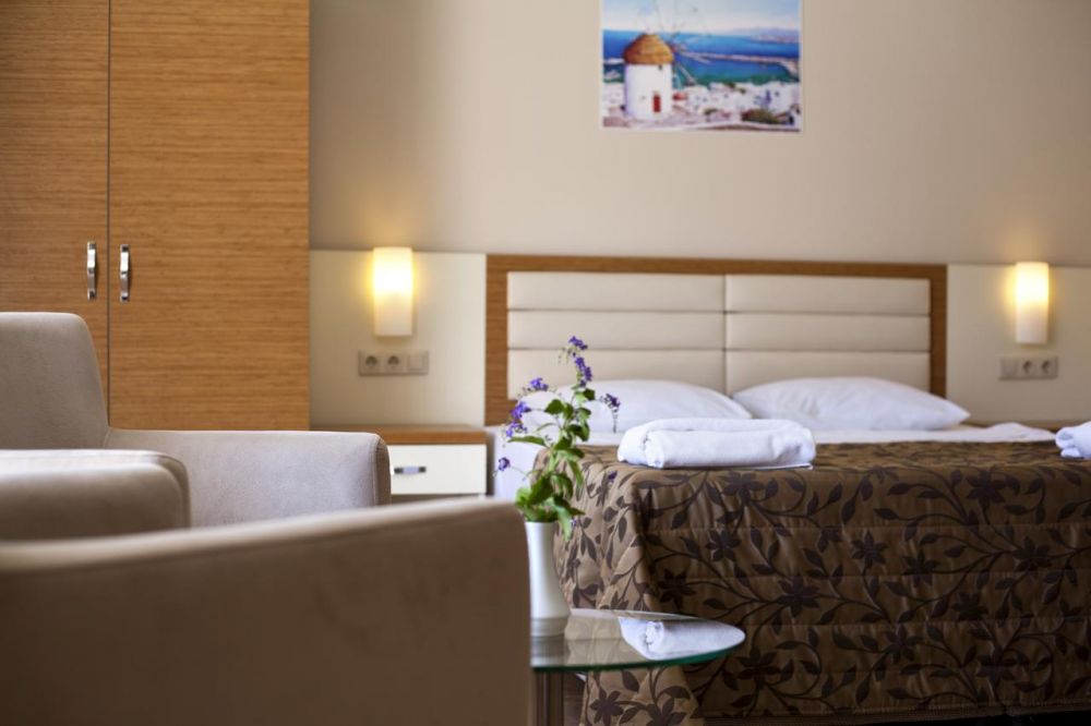 Хотелът разполага с общо 90 стаи, разположени в 3-етажна сгради, от които 70 Standard room (17 м²), 20 Large Room (35 м², спалня и двуетажно легло). Всички стаи са оборудвани с климатик, телевизор, телефон, баня с душ, сешоар, сет за чай/кафе, минибар (наличен само в деня на настаняване; безплатен за гости на All Inclusive), сейф (безплатен).