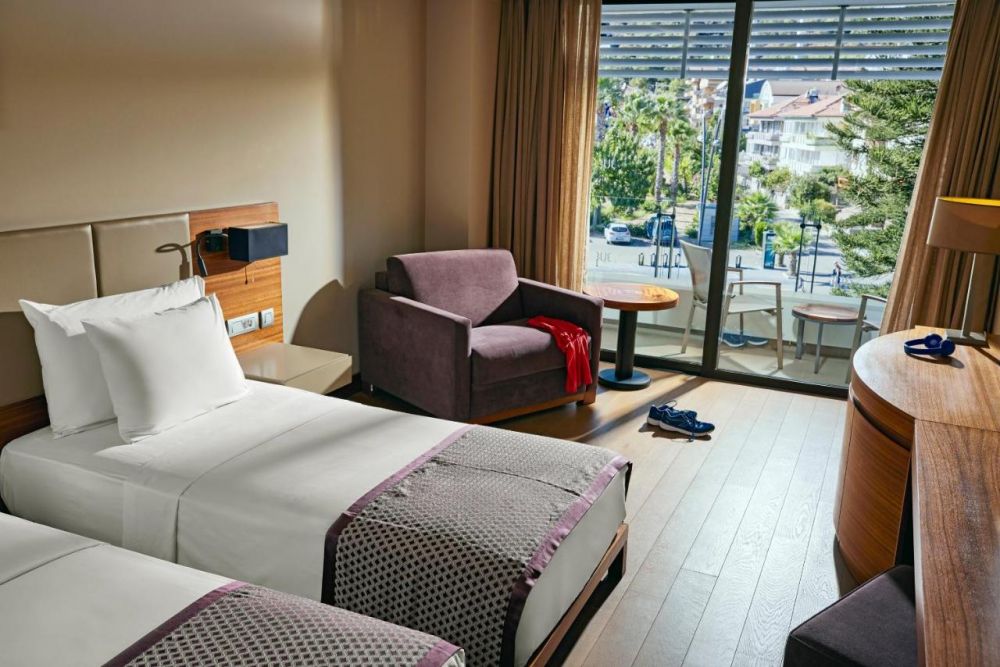 Хотелът разполага общо с 324 стаи, разположени в една основна сграда на 5 етажа (7 асансьора), Standard Land View/ Partial Sea View/ Sea View (28 m²), Suite Land View/ sea view (спалня и всекидневна с междинна врата и разтегателен диван- 55 m²), Suite Room Limited Sea View (спалня и всекидневна- 55 m²), Deluxe Suite Sea View (спалня и всекидневна, отделна вана с джакузи- намира се на петия етаж на сградата- 50 m²). Всички стаи са оборудвани с климатик, телевизор, телефон, сет за чай/кафе, баня с душ, сешоар, сейф (платен), мини бар (ежедневно зареждане с вода), интернет (платен), халат и чехли, балкон, допълнителни услуги в суитите (кафе машина с капсули, ютия и дъска за гладене). Почистване на стаите - всеки ден, смяна на спалното бельо и кърпите - 3 пъти в седмицата.